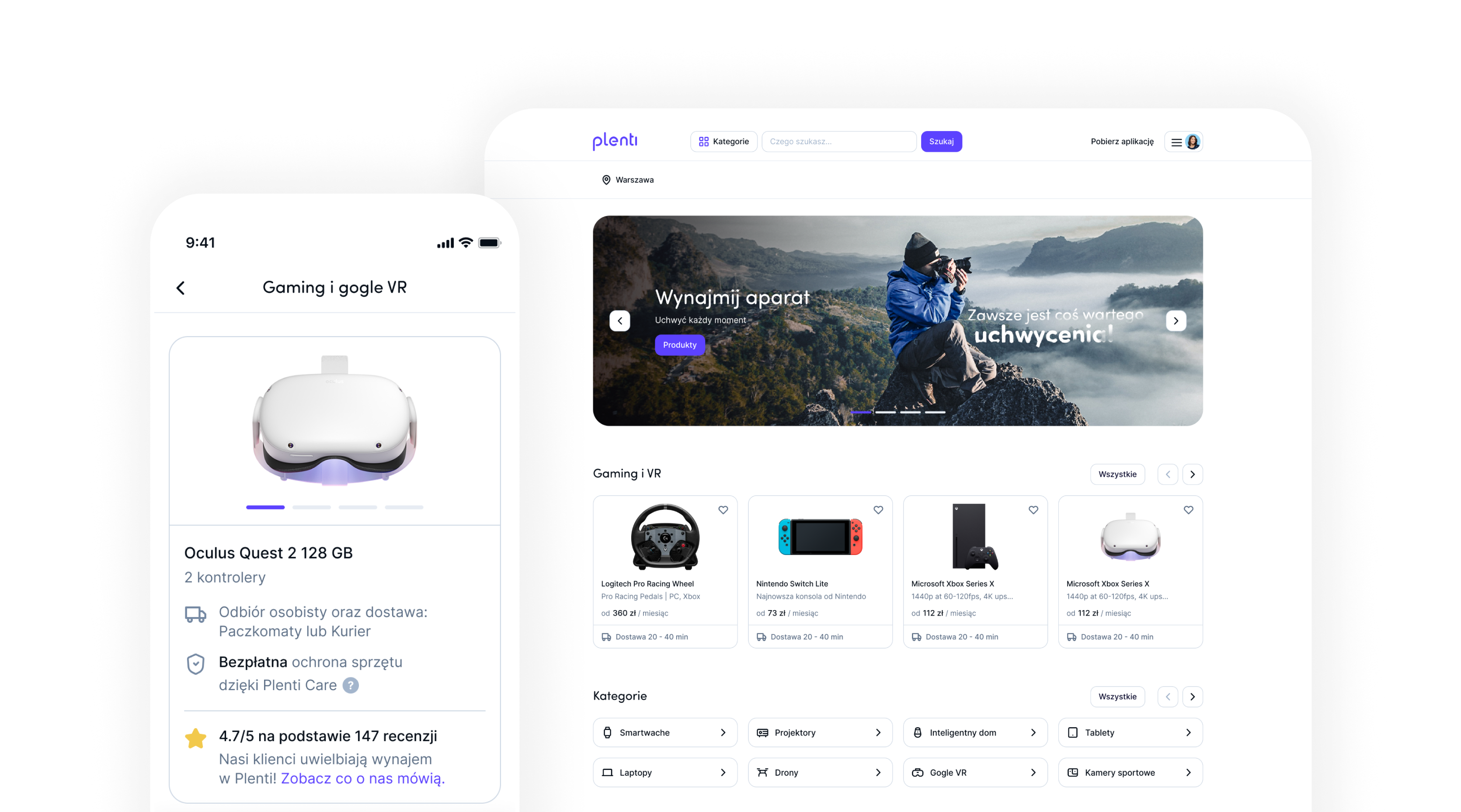 Z Plenti technologia jest jeszcze bliżej. Wynajmuj urządzenia z dostawą do domu, nie tylko w większych miastach, jak Warszawa, Kraków, Poznań czy Wrocław. Działamy w całej Polsce, a wynajem zrealizujesz za pomocą aplikacji. To tysiące sprzętów w Twojej kieszeni! Drony, konsole, komputery, czy sprzęt audio – w aplikacji Plenti znajdziesz znacznie więcej.